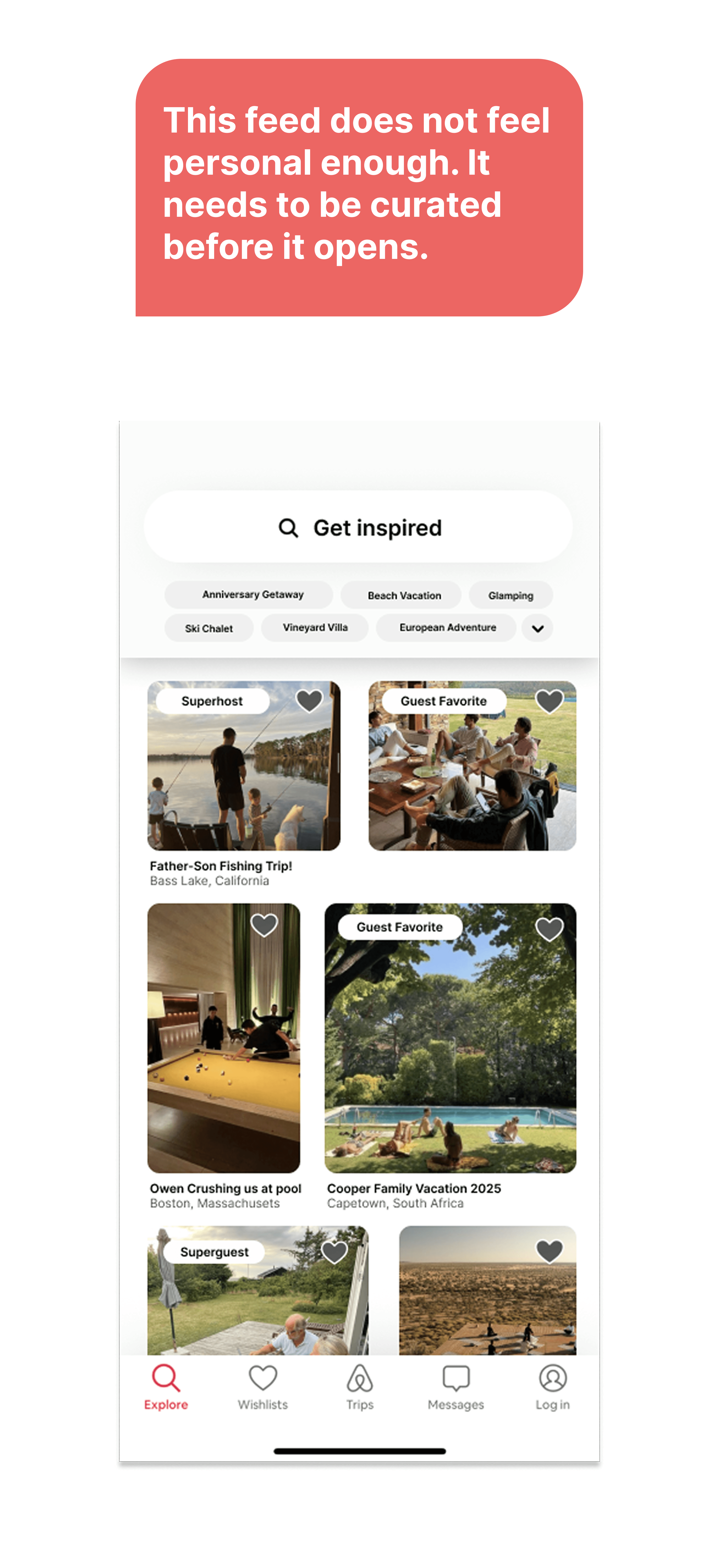 Users aren't resonating with the listings seen on the app, and aren't excited enough to balance the frustration of the expenses and logistics that come with booking a stay.