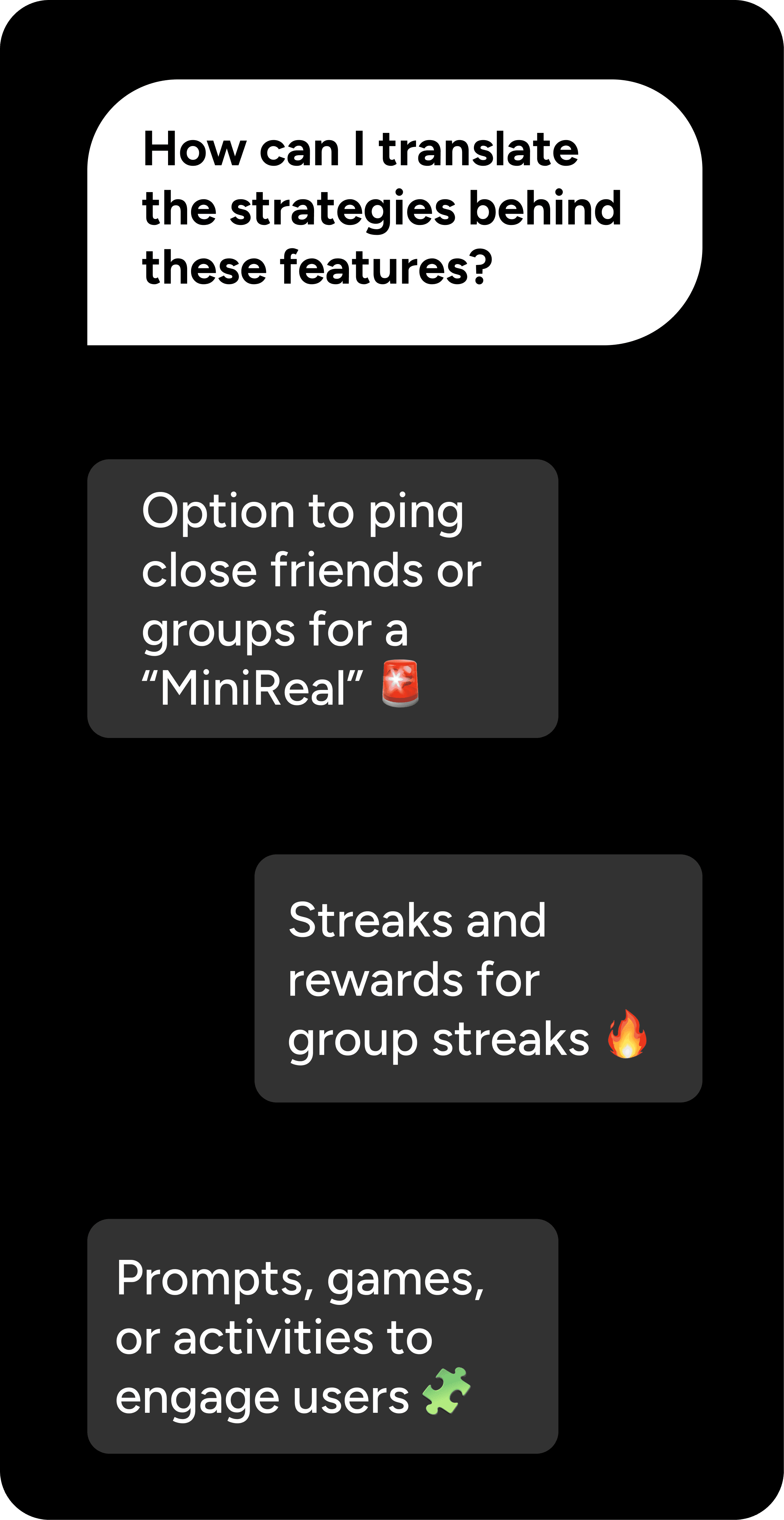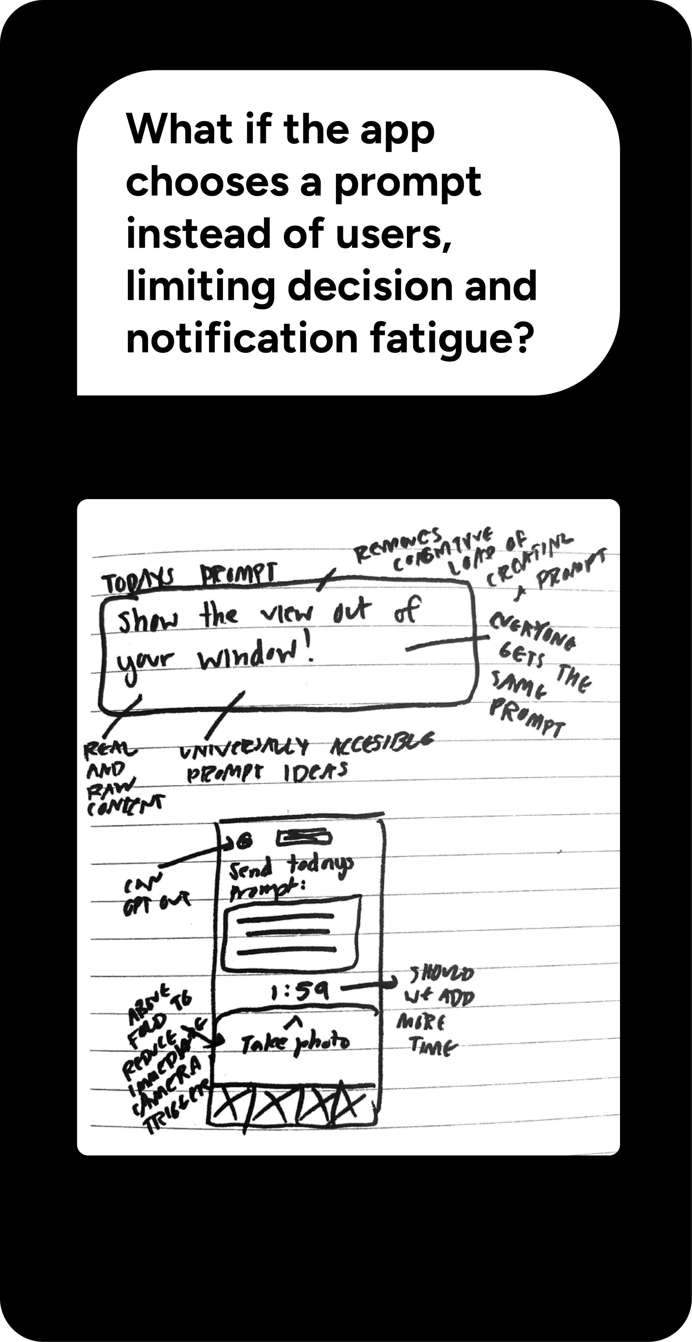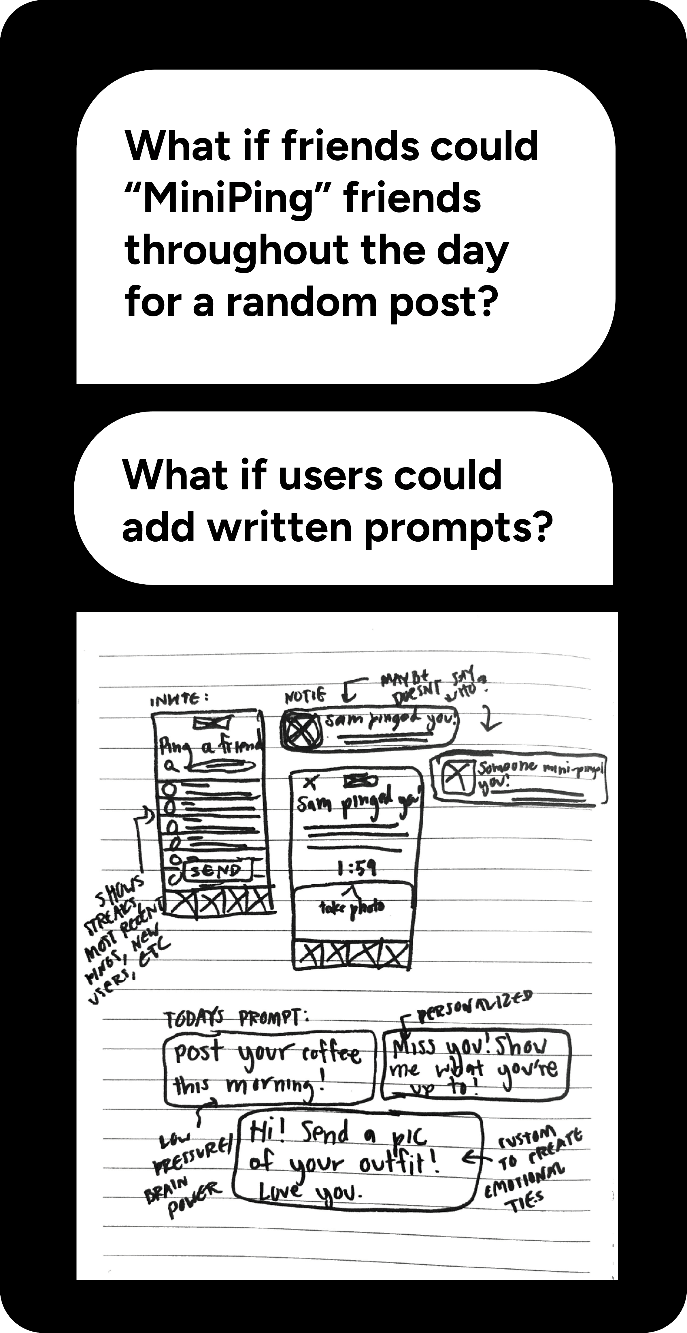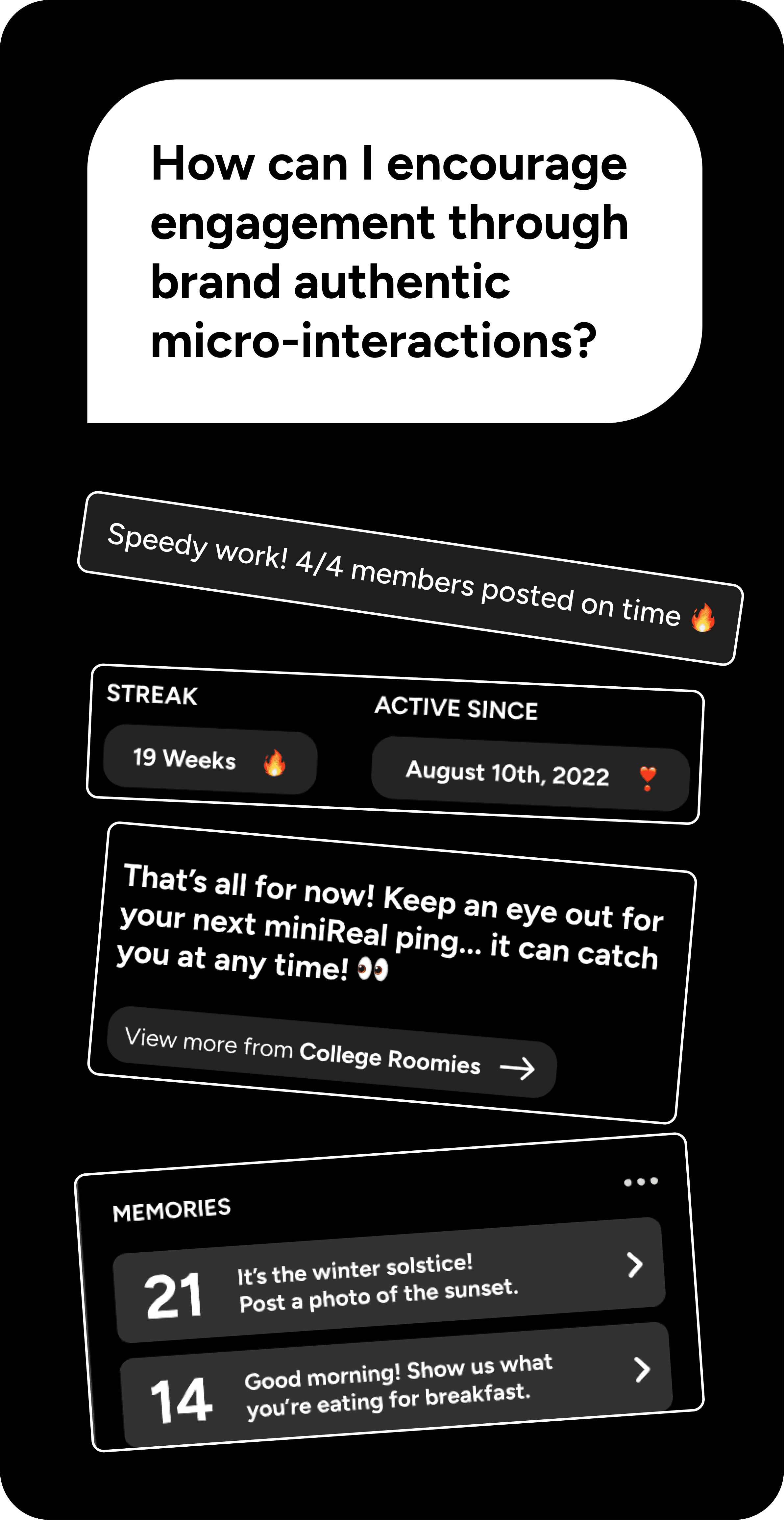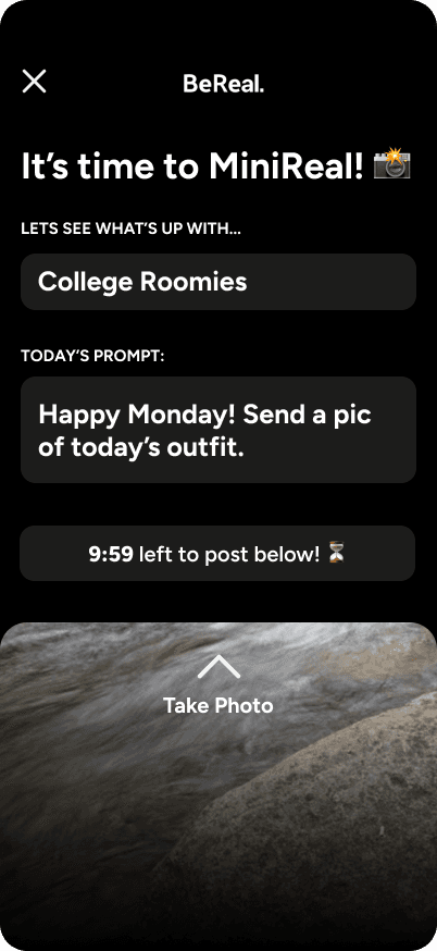 Decision: Incorporate a smaller scale version of BeReal's feature Why: Research shows that users are more likely to revisit and enjoy consistent use of an app if there is a more intimate social connection that subconsciously holds them accountable Result: Increased retention and reengagement