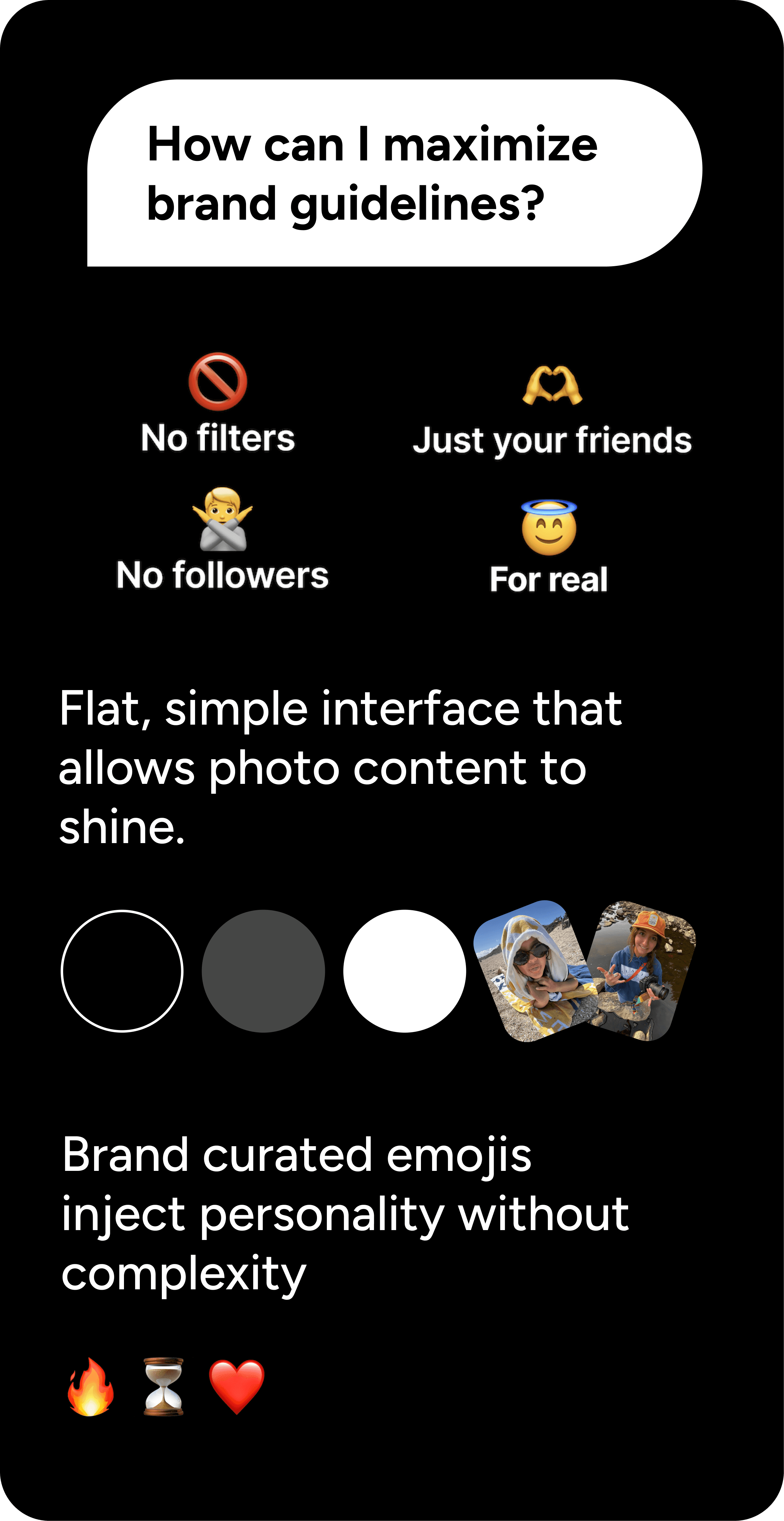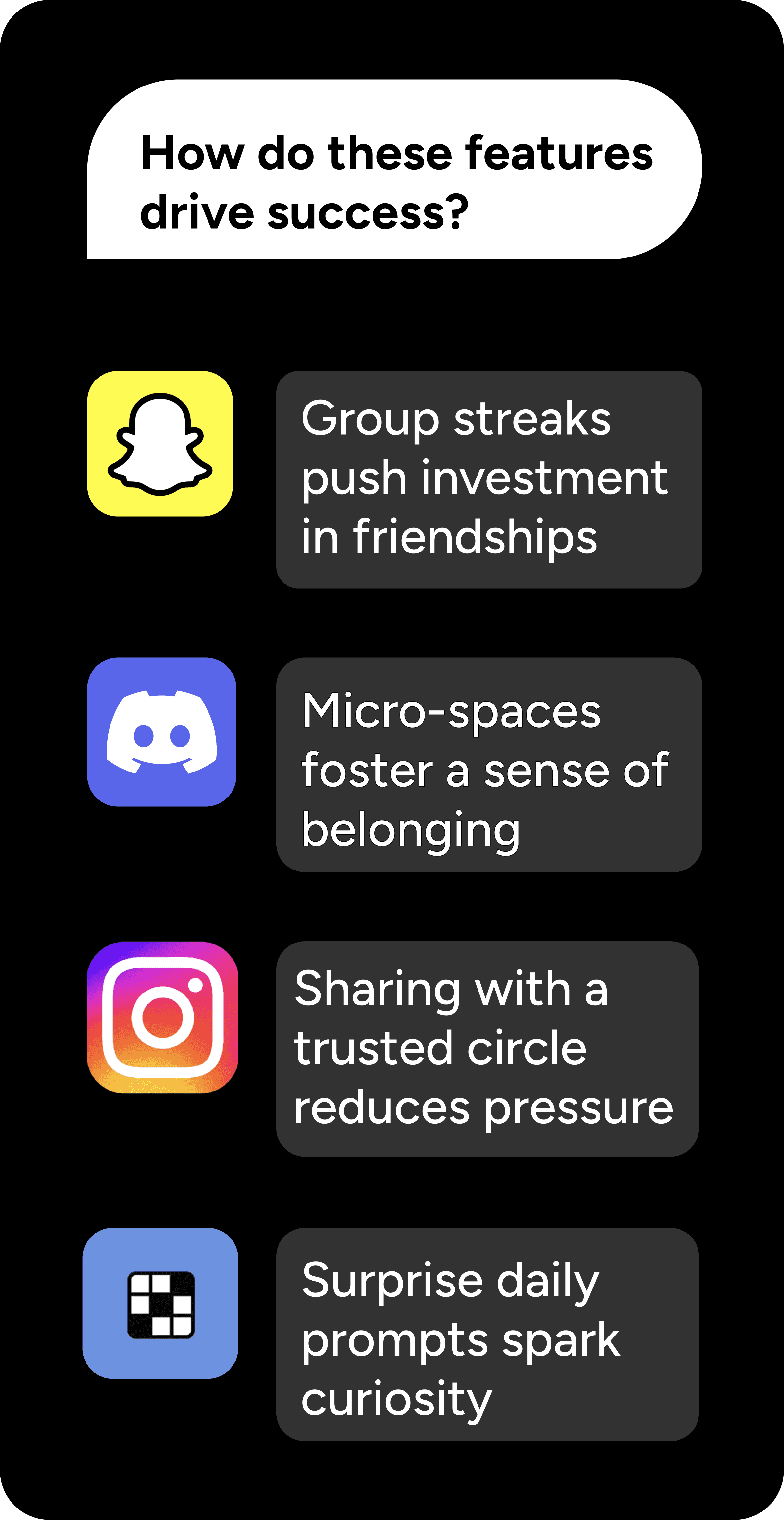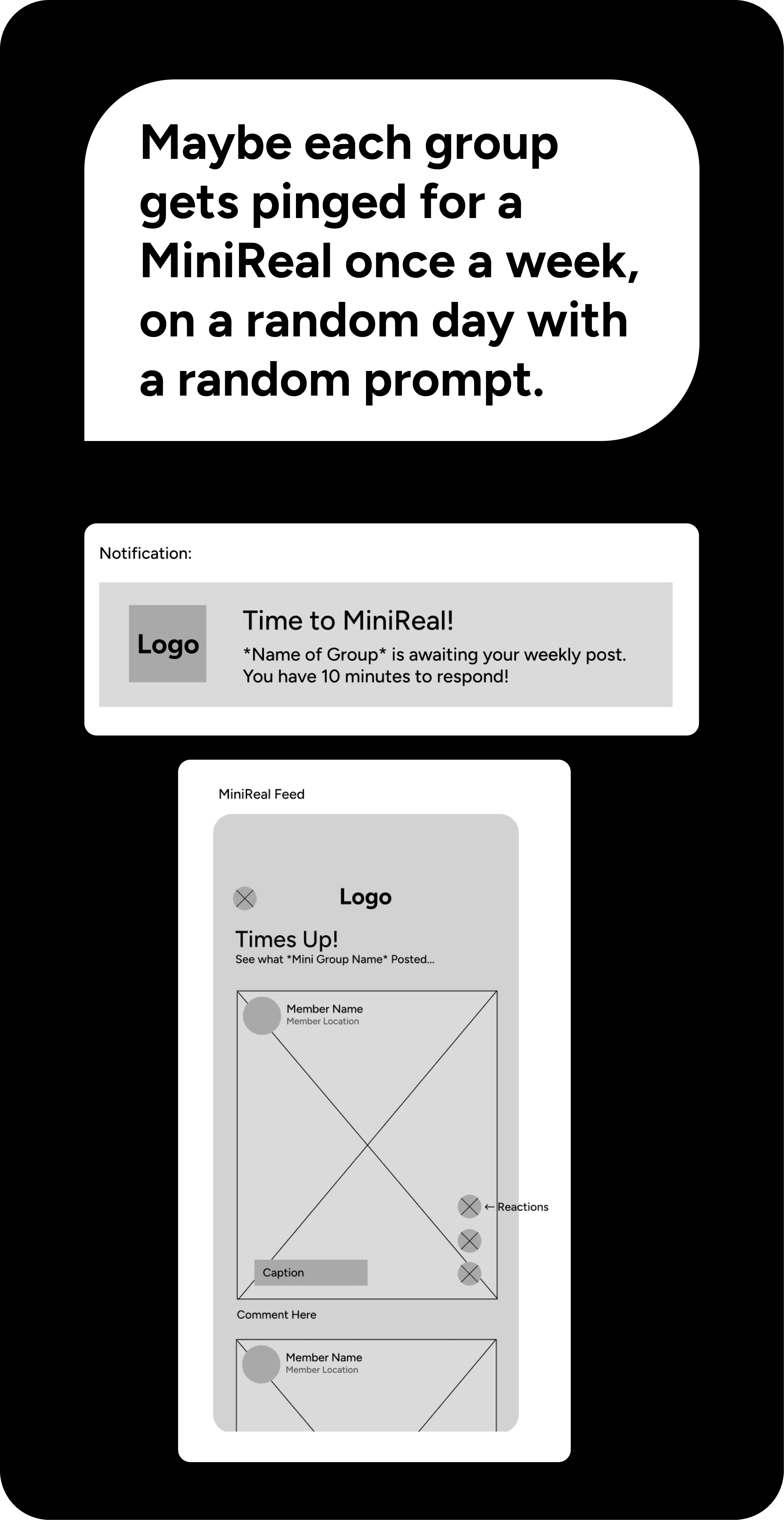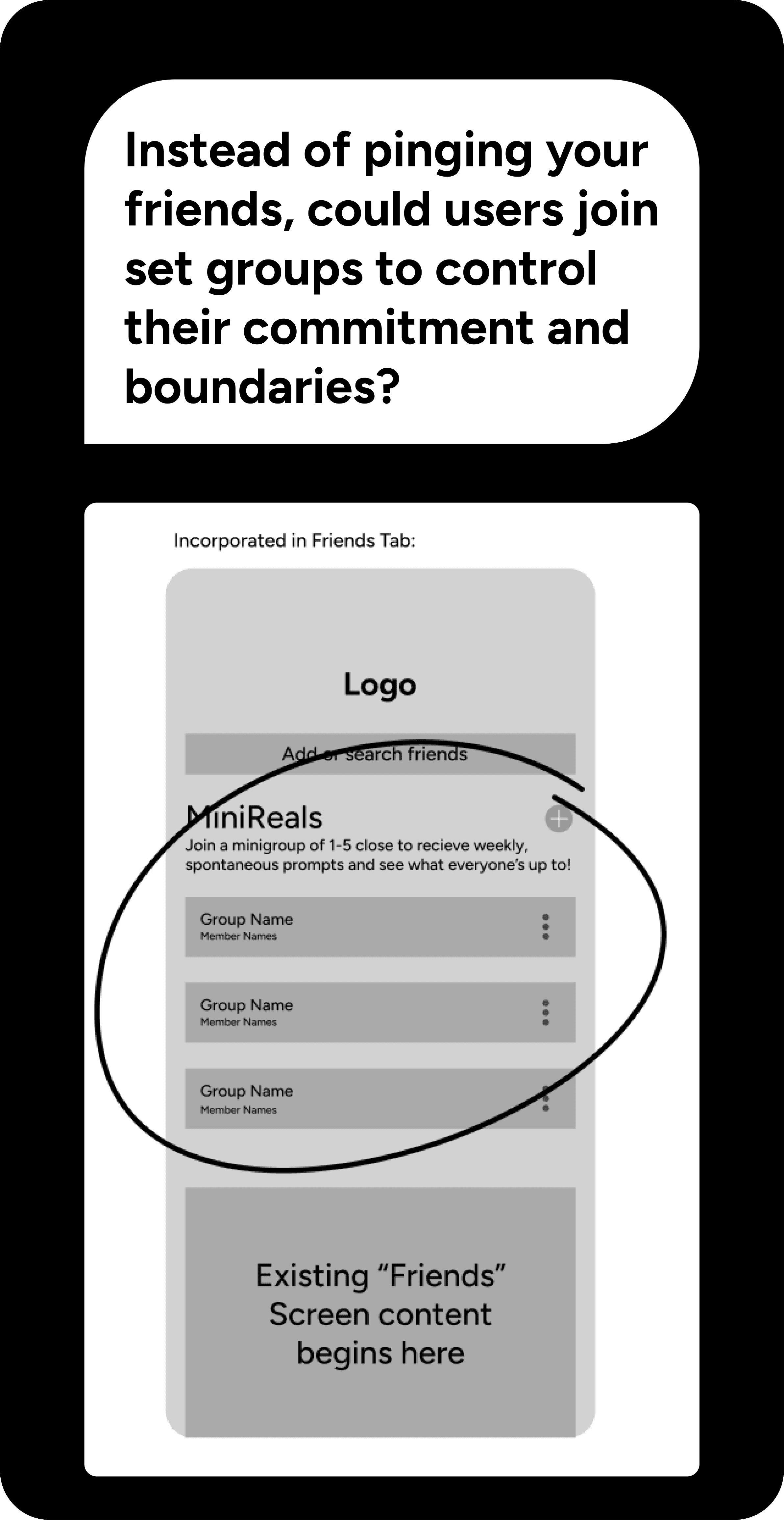 Decision: Incorporate a smaller scale version of BeReal's feature Why: Research shows that users are more likely to revisit and enjoy consistent use of an app if there is a more intimate social connection that subconsciously holds them accountable Result: Increased retention and reengagement