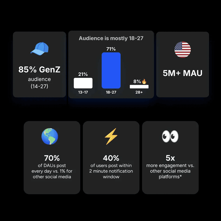 BeReal has surpassed 100 million downloads worldwide and maintains a strong Gen Z user base across key global markets. Users engage with the app daily around a shared moment, resulting in highly intentional, authentic interactions.