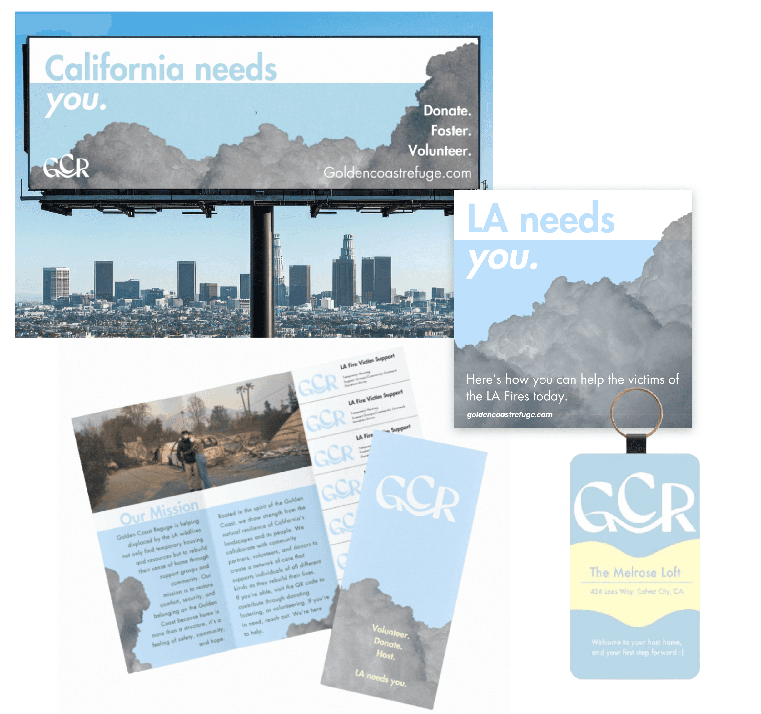 I brought GCR’s brand to life through a Los Angeles billboard, a social media graphic encouraging volunteering, a resource pamphlet with removable tabs, and a key card for new residents.