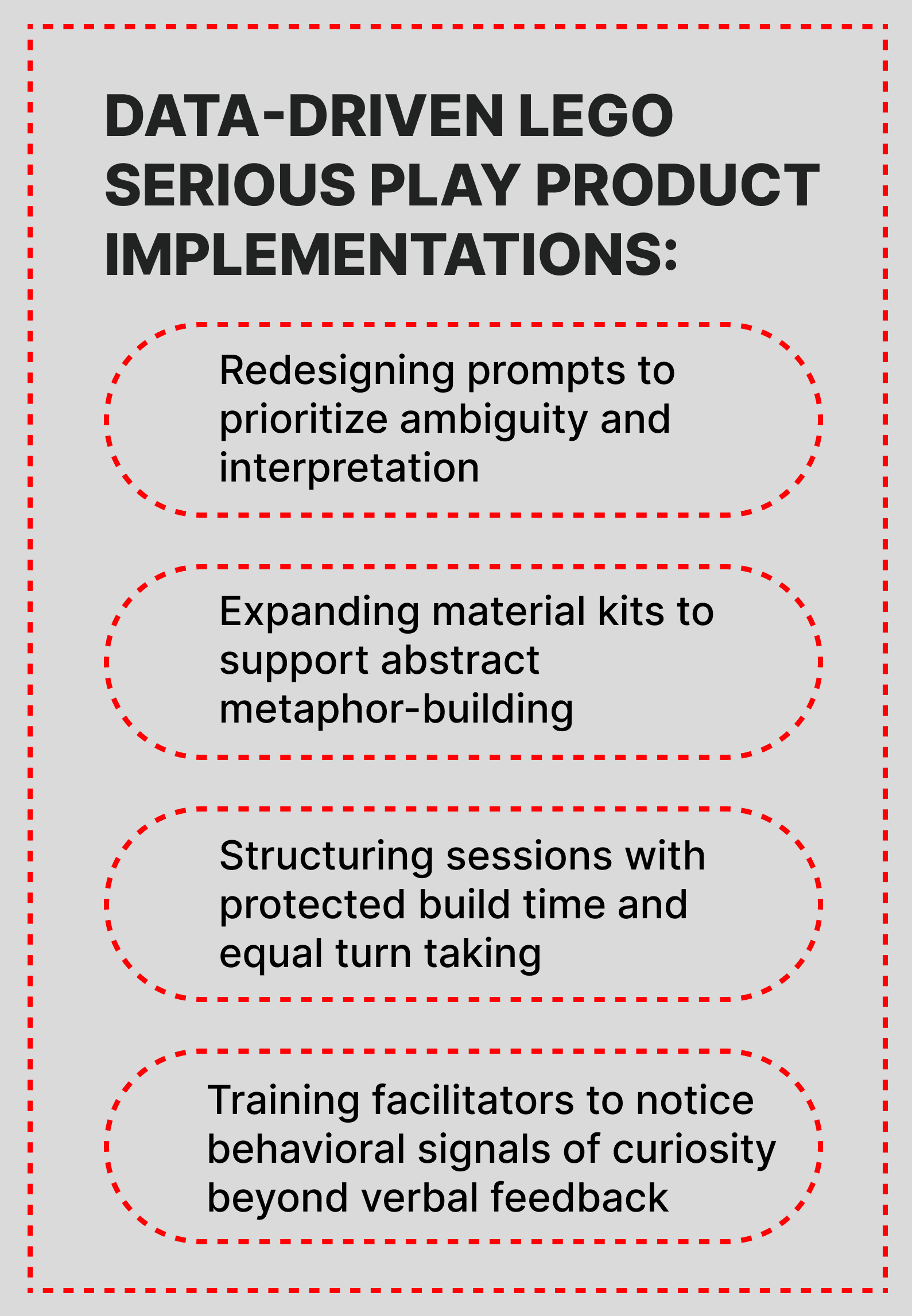 Recommendations resulted in 3 features being incorporated to increase inclusivity and collaborative play in the next model of LEGO Serious Play