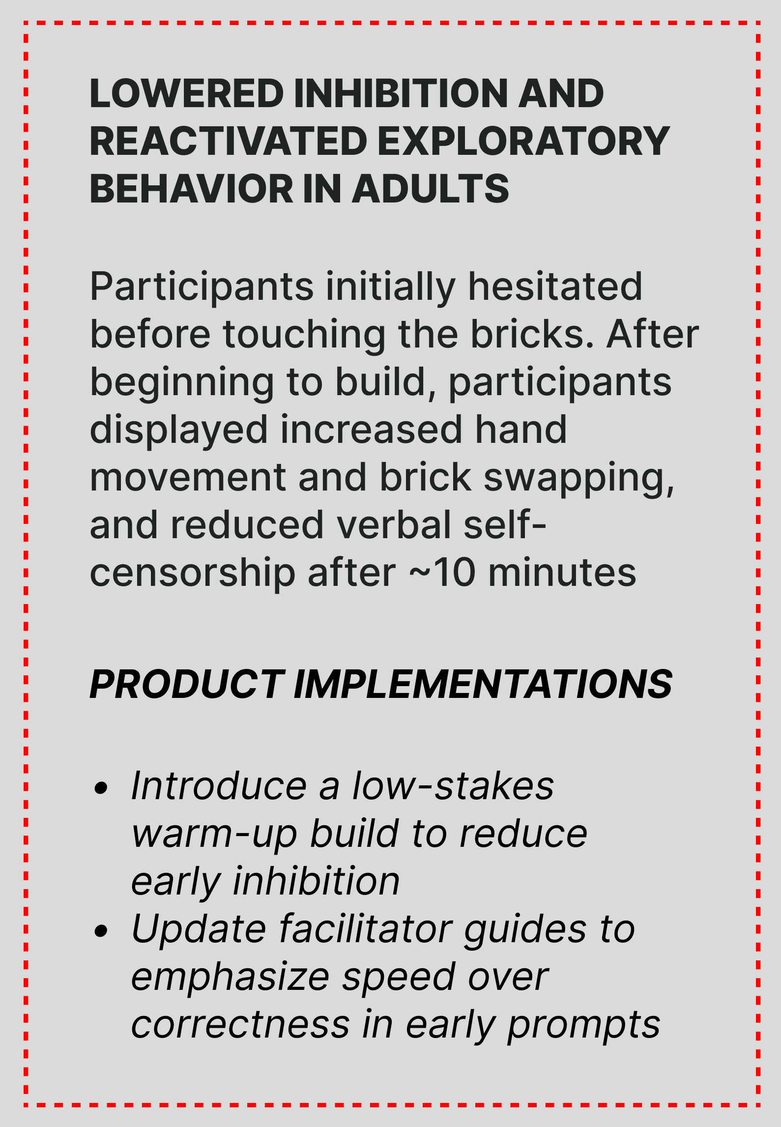 We paired 20 participants, gave them a LEGO set, and evaluated their behavior, noting how the product affected their ability to think and act creatively.
