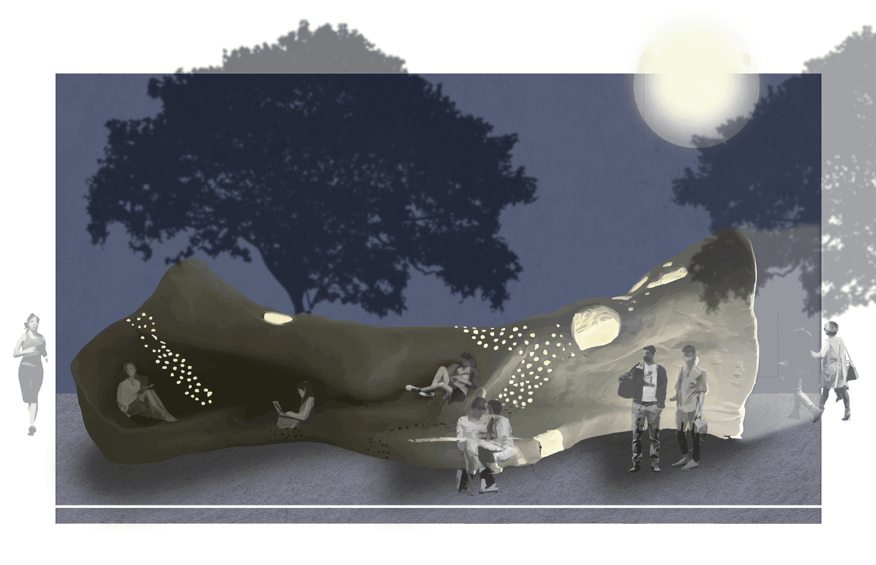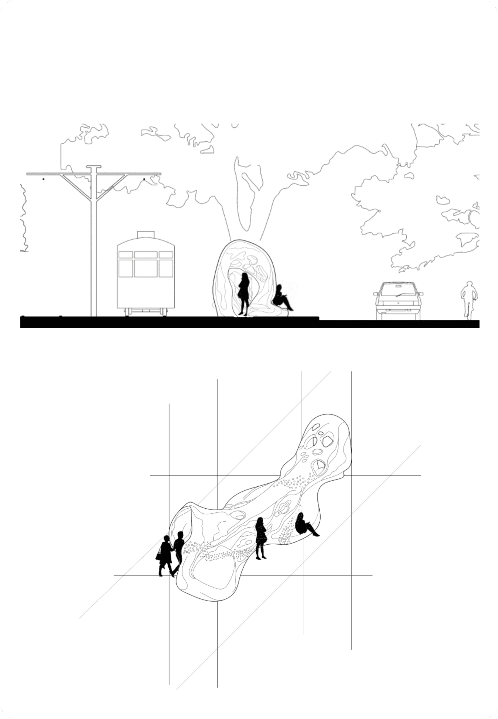 This schematic streetcar pavilion connects users to Voodoo’s organic origins, its overlooked beauty, and its roots in the natural world. As users walk through an immersive cave, the space will challenge their perceptions of voodoo as a dark and evil taboo through abstracted shadow and light projections inspired by voodoo traditions.